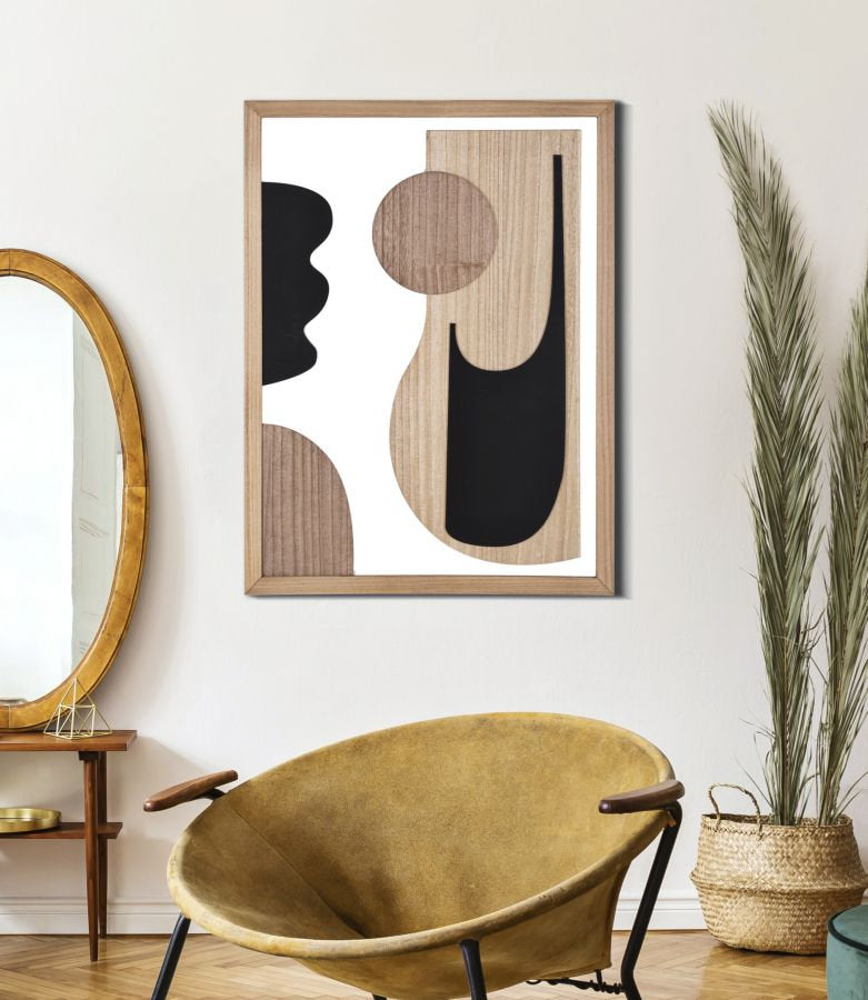 Panel de madera con geometría abstracta y ricos tonos cálidos