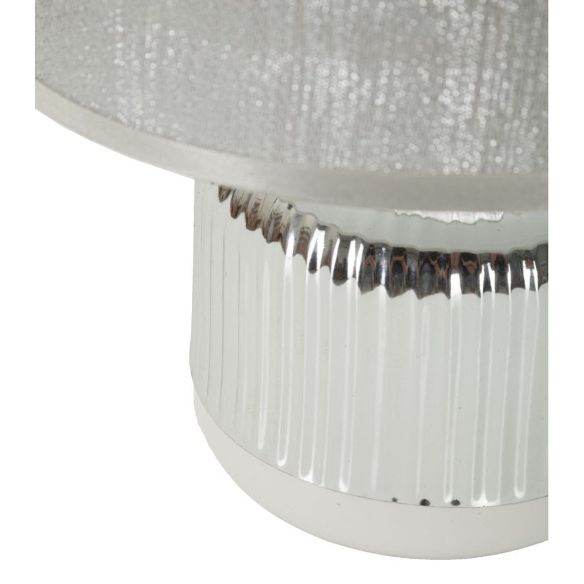 Lámpara de cerámica plateada y blanca con detalles geométricos en relieve