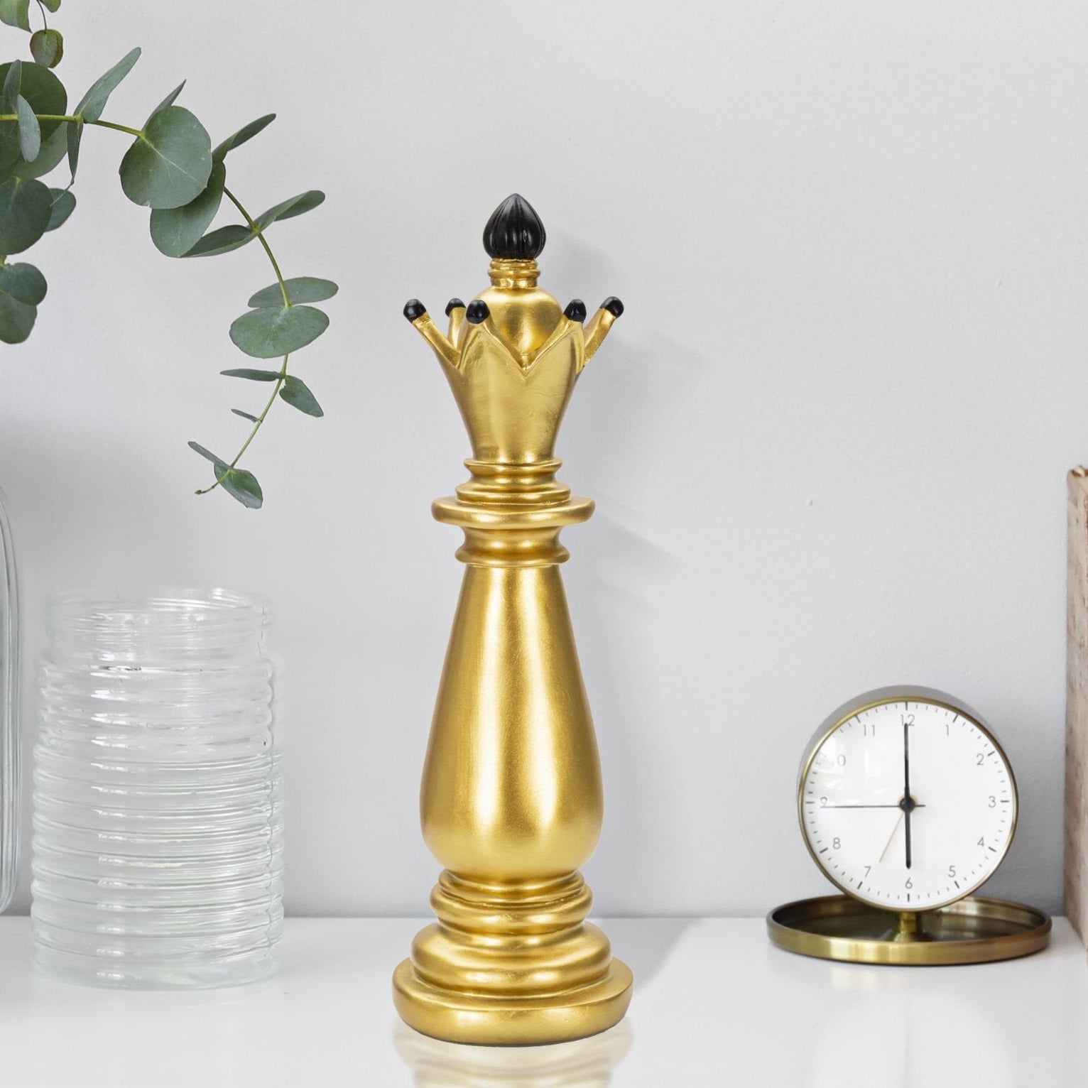 Alfil de ajedrez dorado con detalles decorativos negros