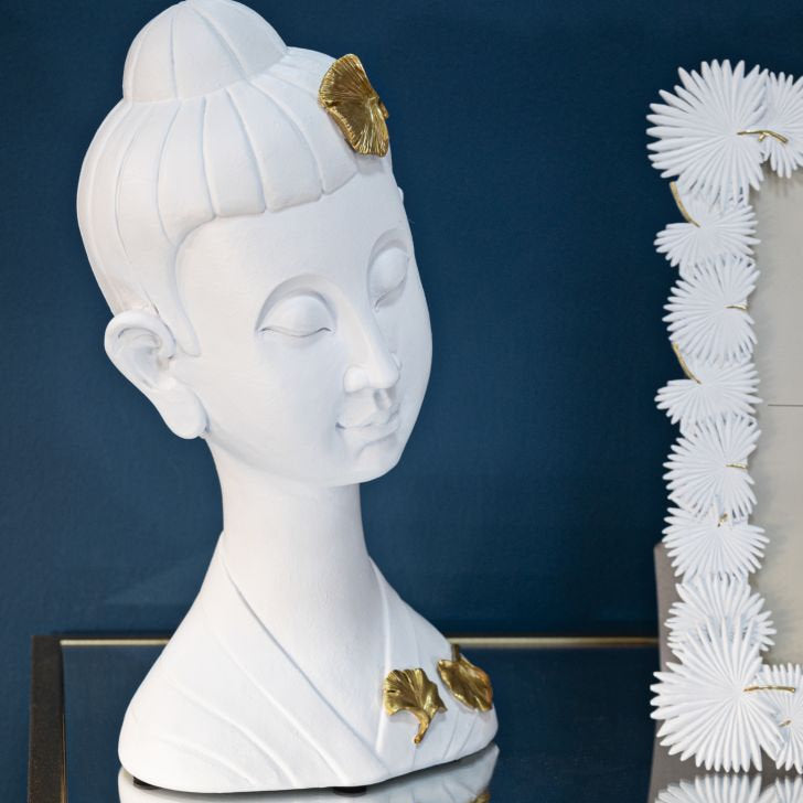 Cabeza de Buda con detalles de hojas doradas: decoración elegante y serena