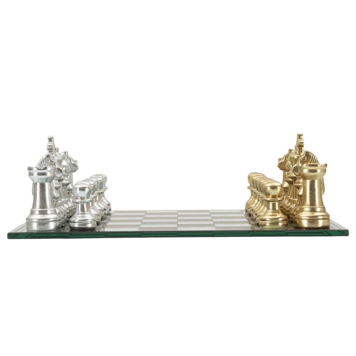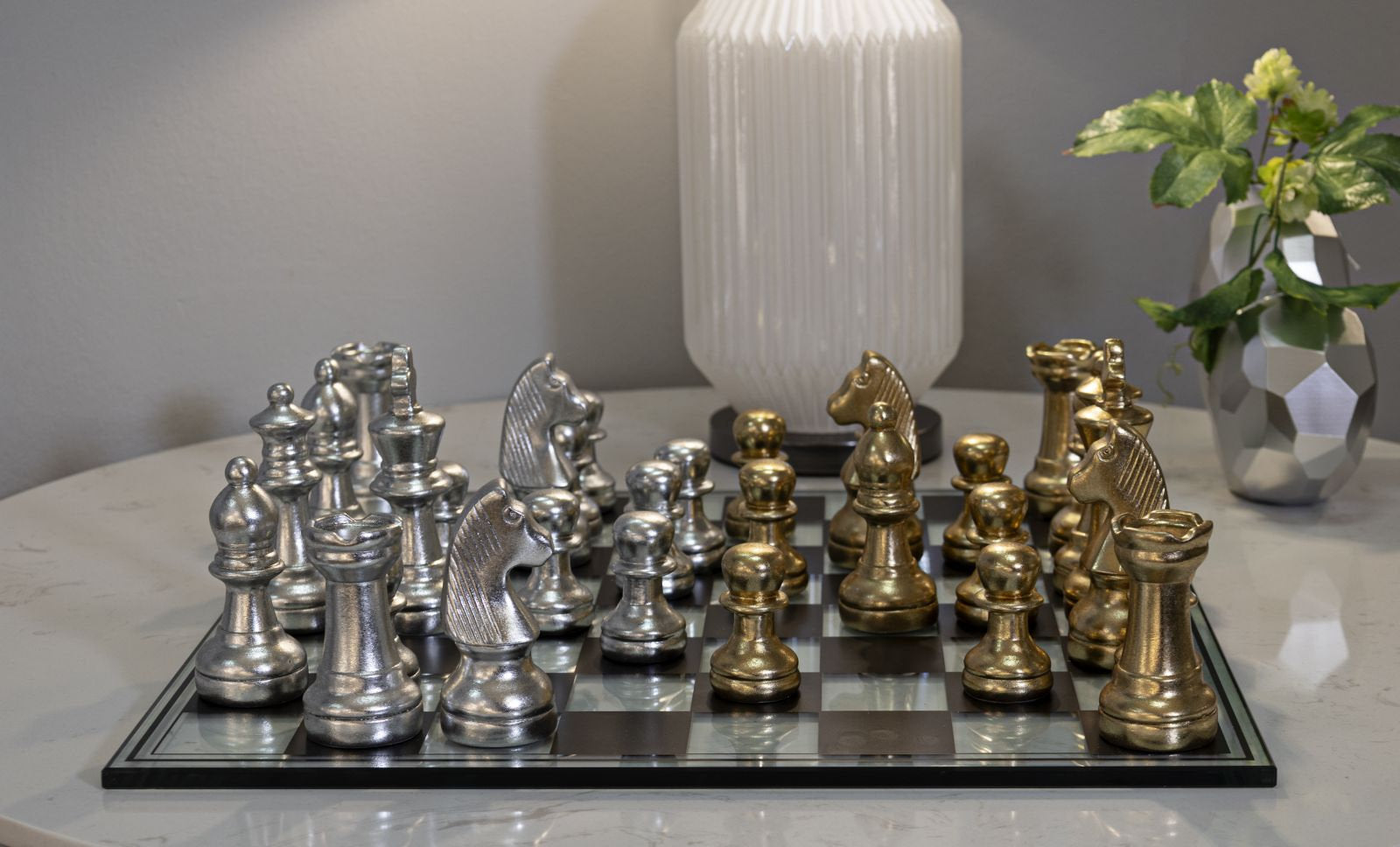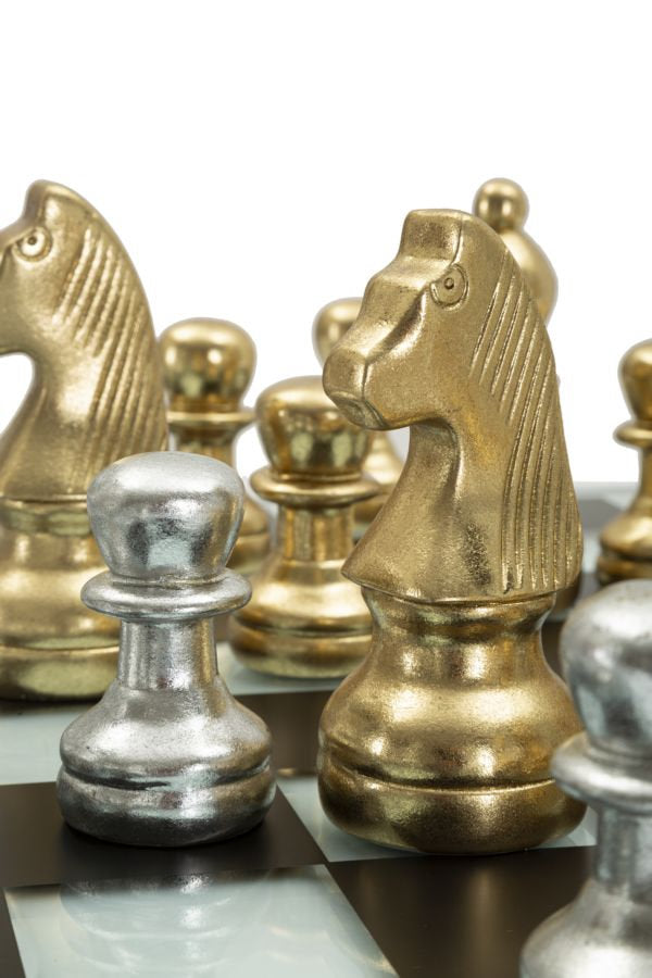 Juego de ajedrez de lujo en blanco y negro con base espejada