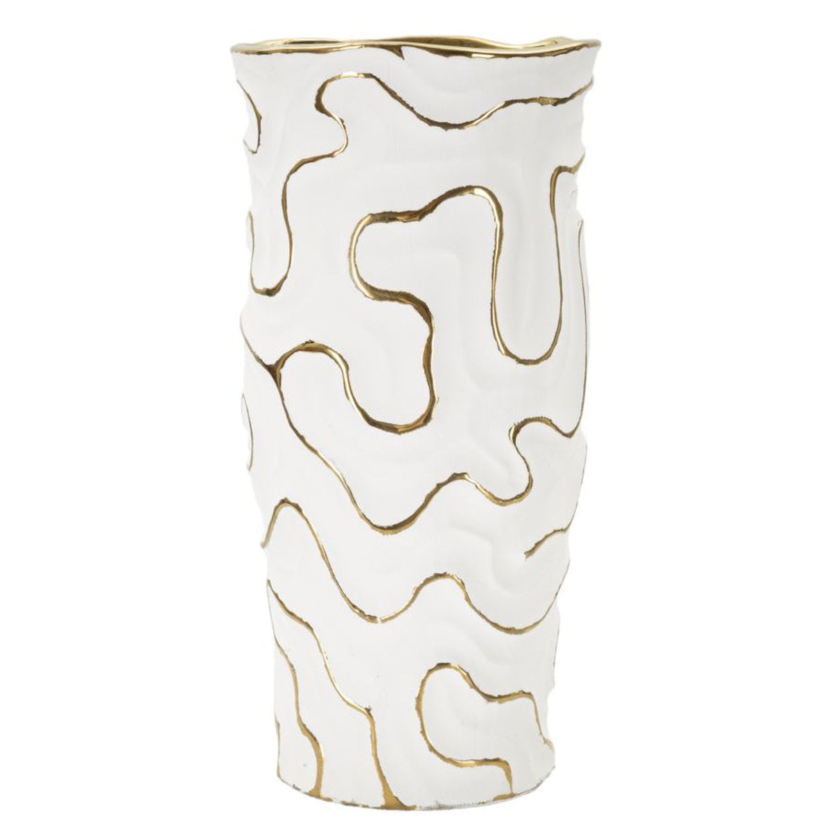 Jarrón de cerámica blanca con refinados detalles de líneas doradas