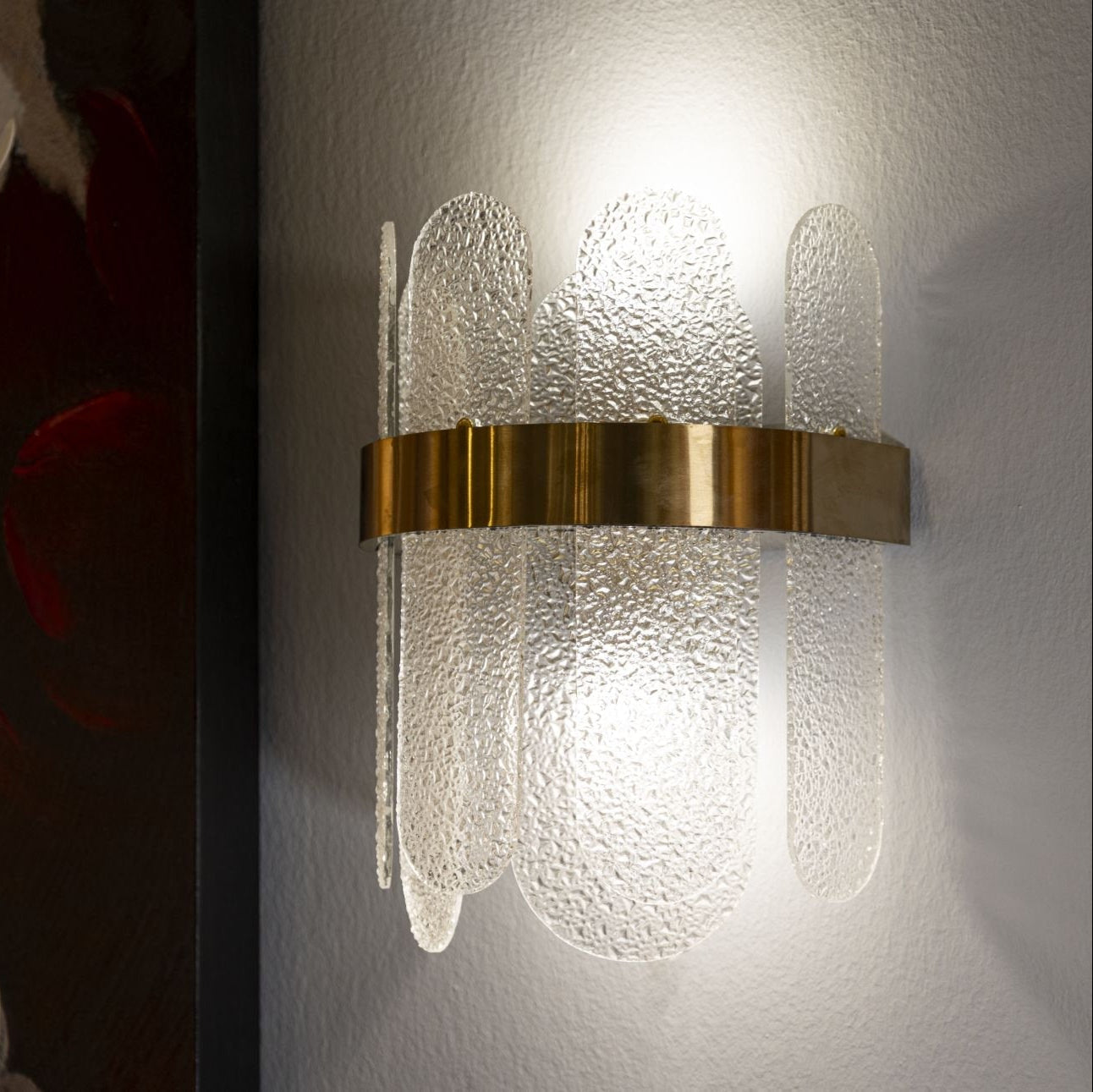 Aplique de pared de cristal satinado con doble luz y banda decorativa dorada