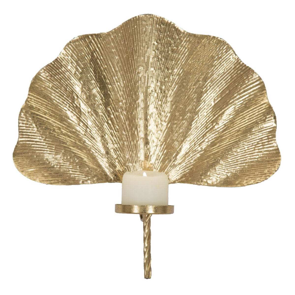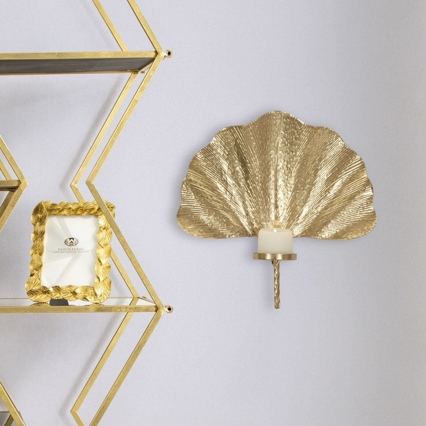 Portavelas de pared dorado con diseño de hojas y luz relajante