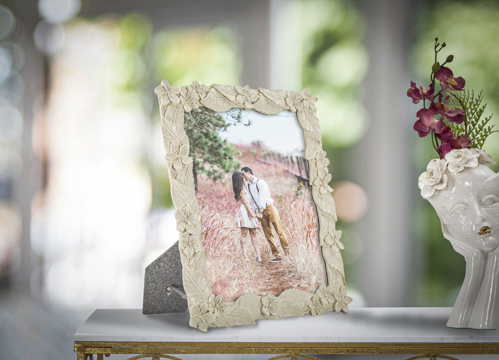 Marco de fotos metálico con diseño de hojas y flores – Diseño natural refinado (20×25)