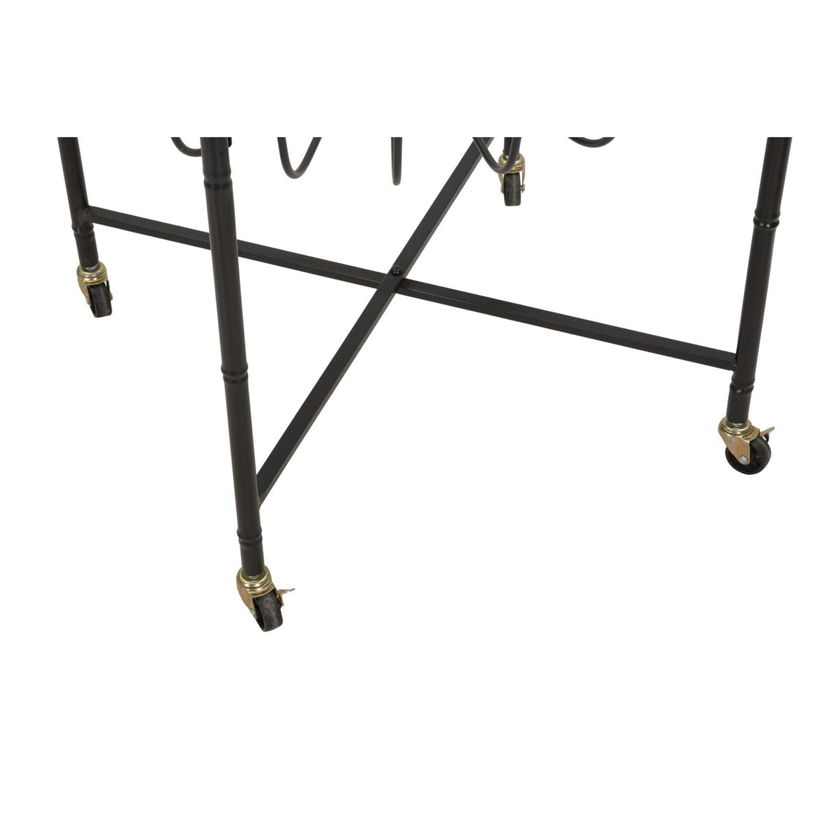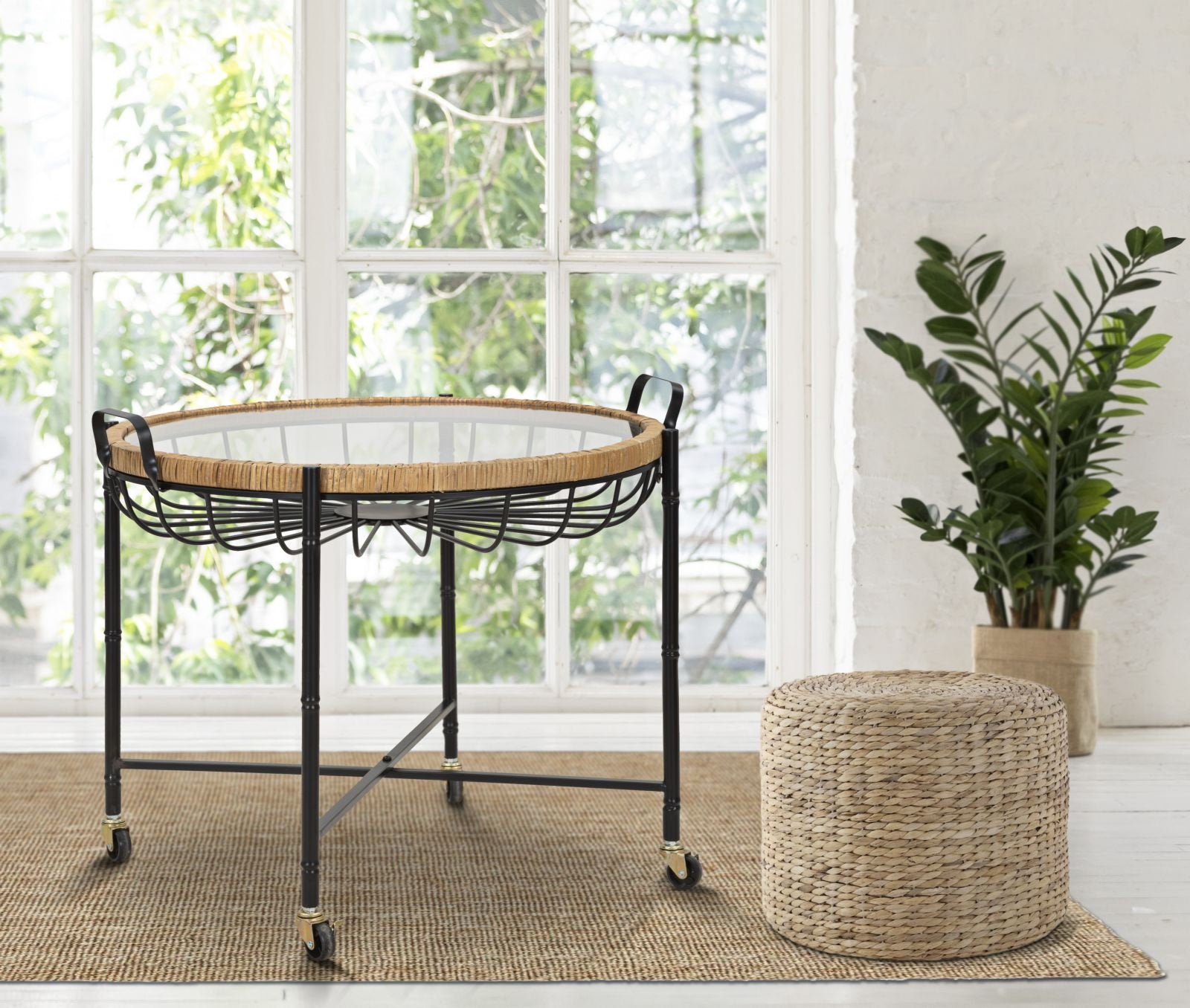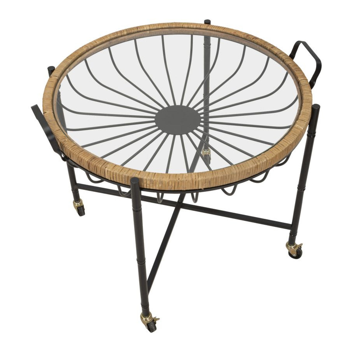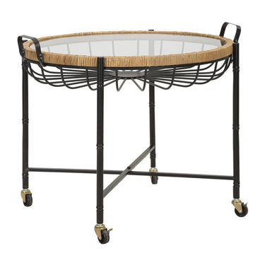 Mesa de centro baja redonda con tapa de cristal enmarcada en ratán y ruedas