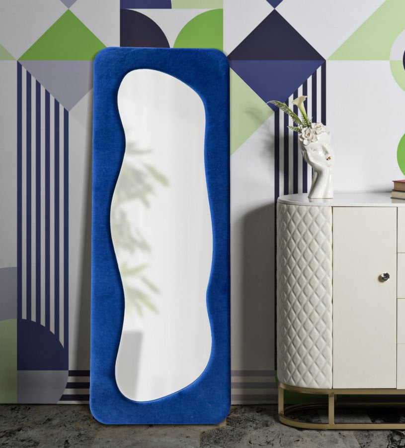 Espejo de pared de terciopelo azul eléctrico con marco de madera