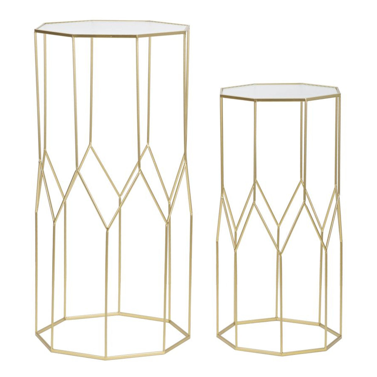 Juego de dos mesas cuadradas de lujo de metal dorado con tapas de cristal con efecto profundidad