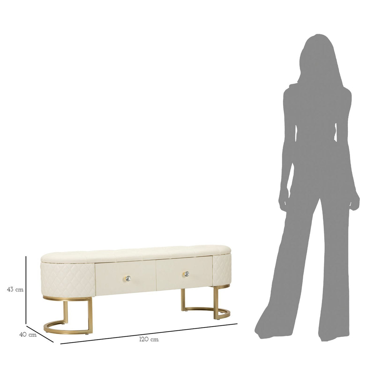 Banco elegante tapizado en piel sintética acolchada con patas circulares doradas y cajones