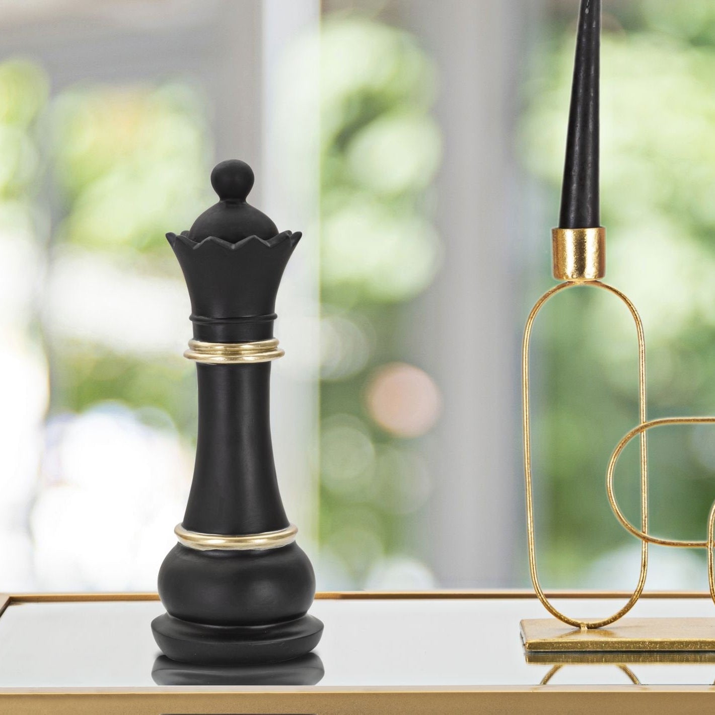 Escultura de la reina del ajedrez en negro y dorado – Decoración moderna