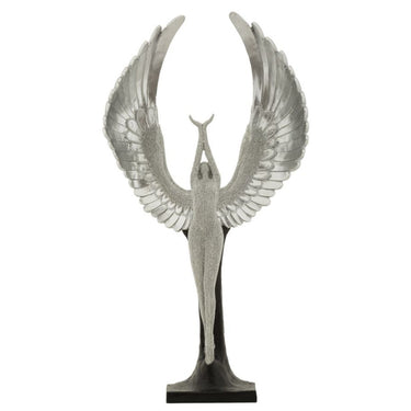 Figura angelical plateada con alas – Decoración dinámica de inspiración clásica