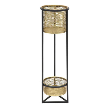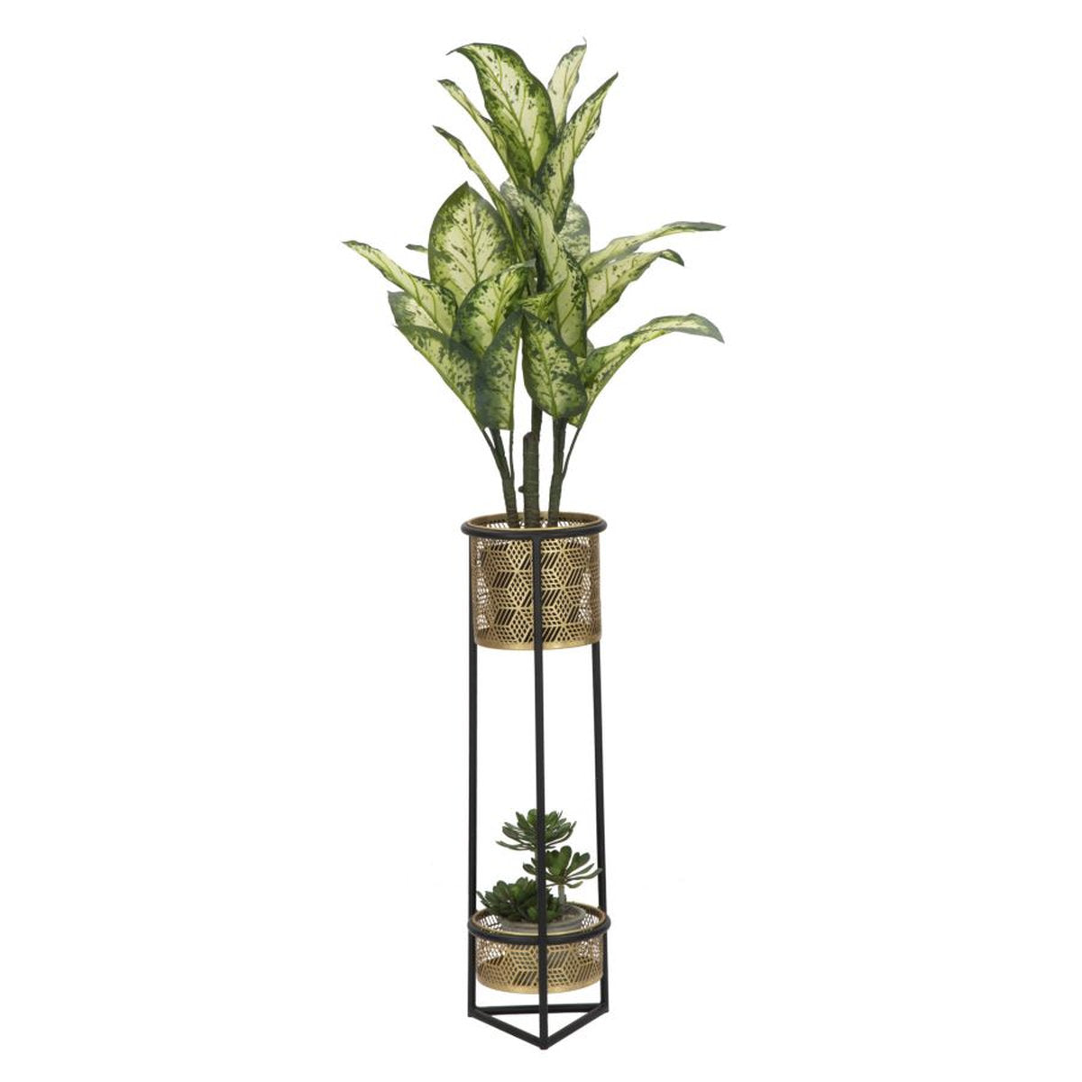 Macetas de metal dorado de dos niveles con base negra – Diseño tallado