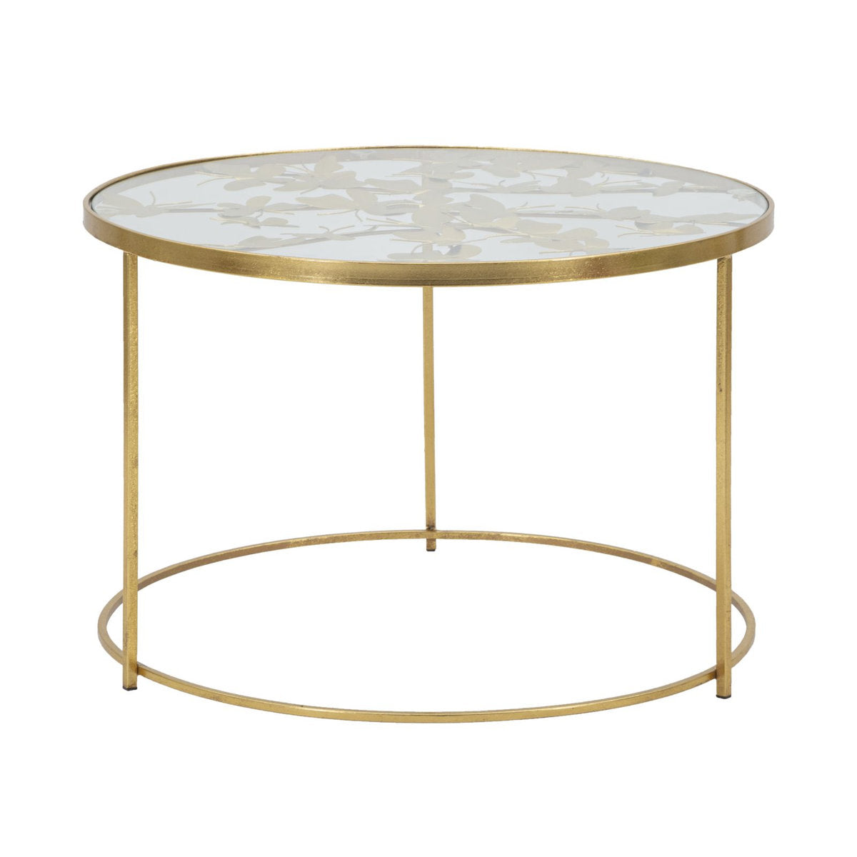 Mesa de centro redonda de metal dorado con tapa de cristal y diseño de mariposa