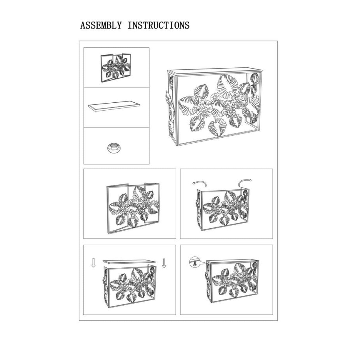Consola de metal dorado con tapa de cristal espejado y diseño floral