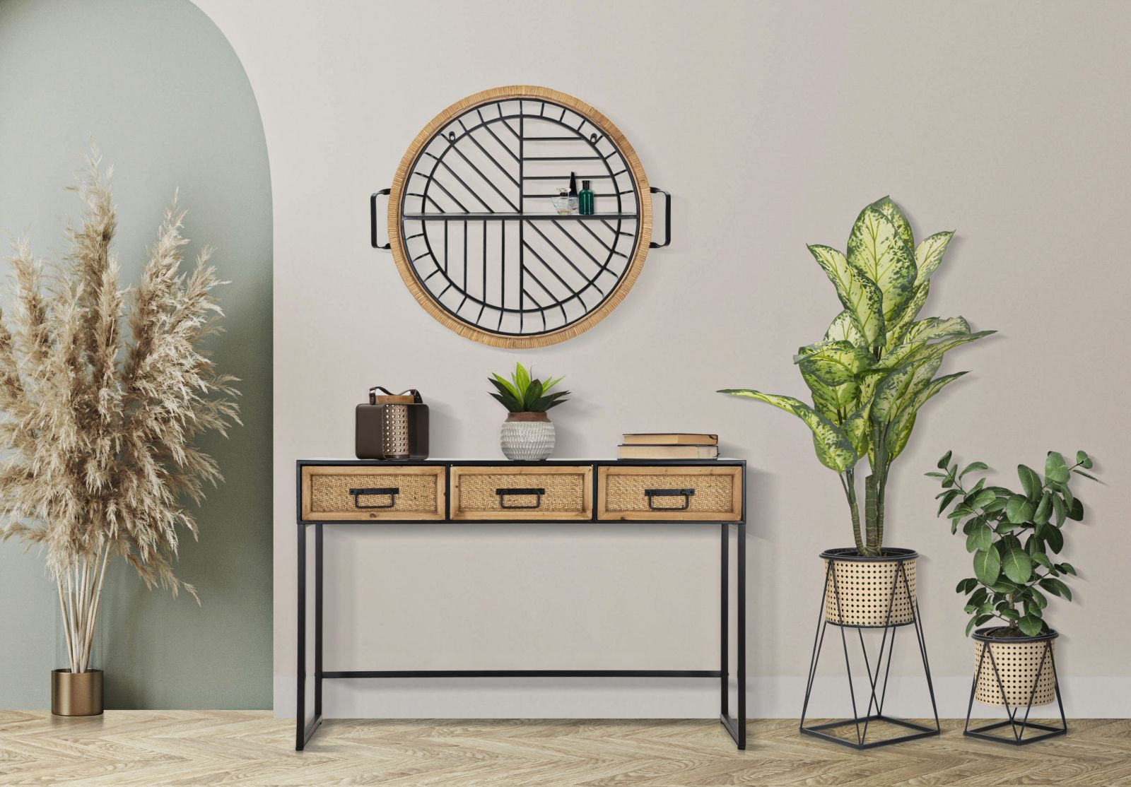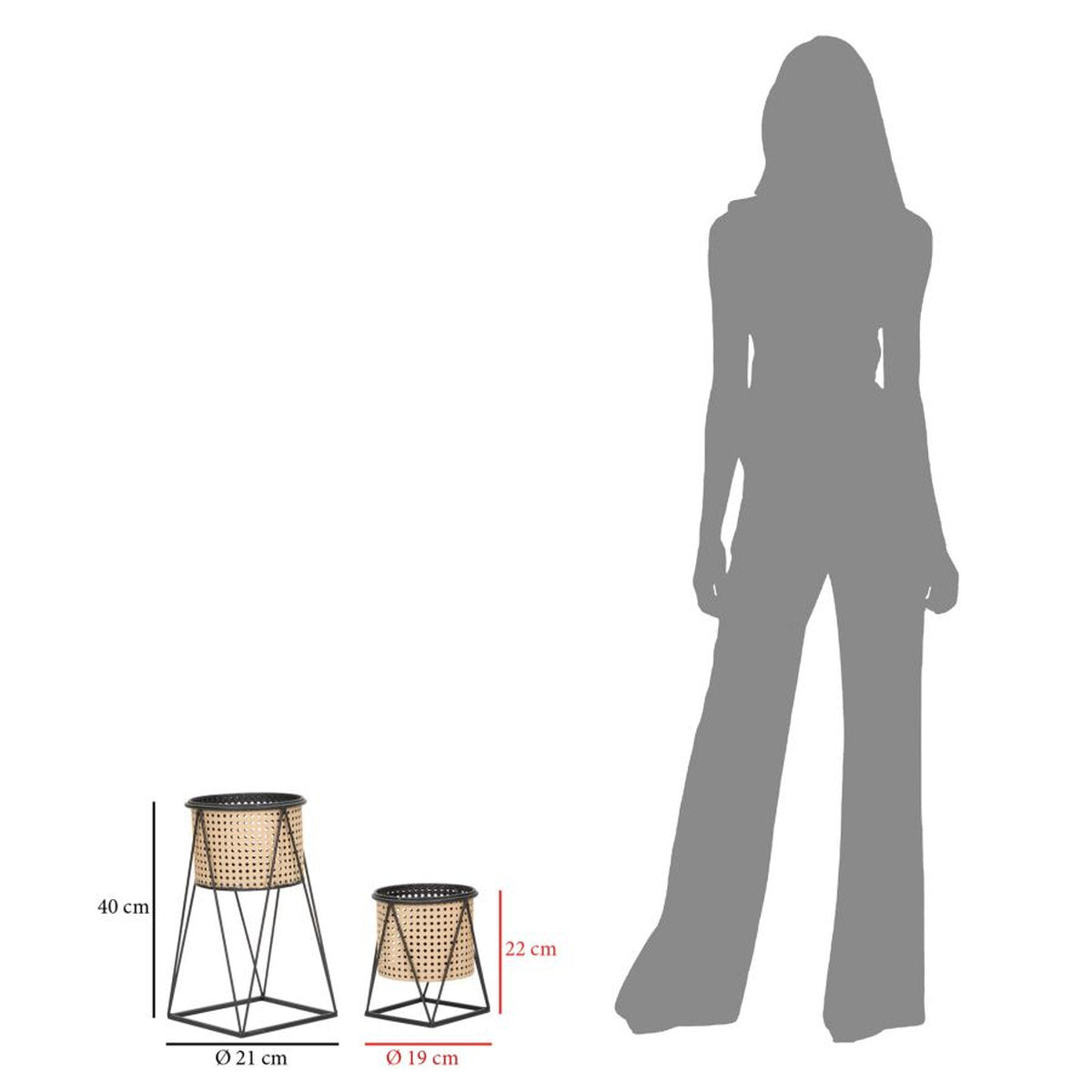 Par de soportes para jarrones de metal color crema con detalles de paja vienesa y pedestal