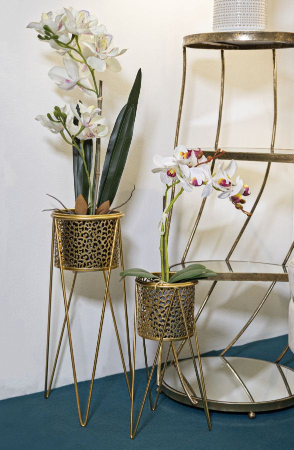 Par de soportes para jarrones de metal dorado con tallas redondas irregulares