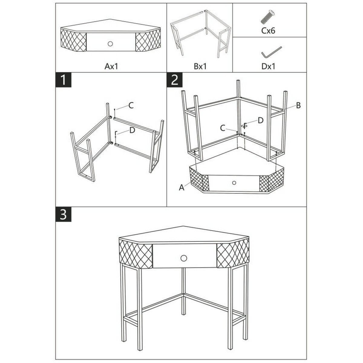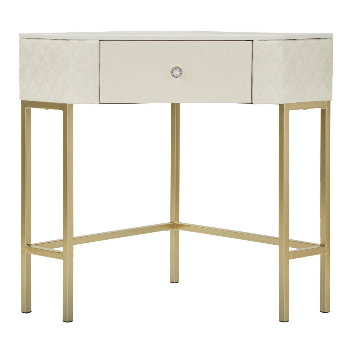 Consola esquinera de cuero acolchado con patas doradas y reposapiés