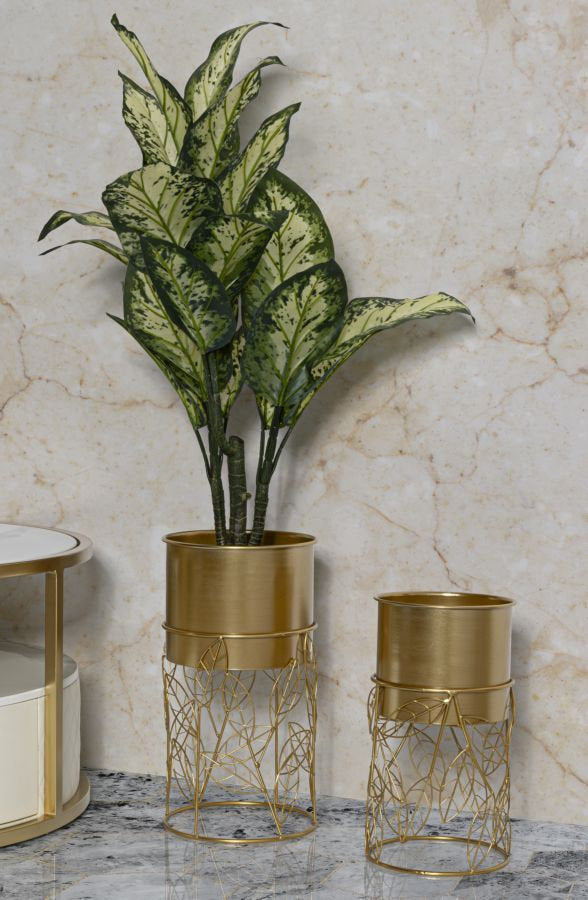 Par de soportes para jarrones de metal dorado con acabado de hoja tejida
