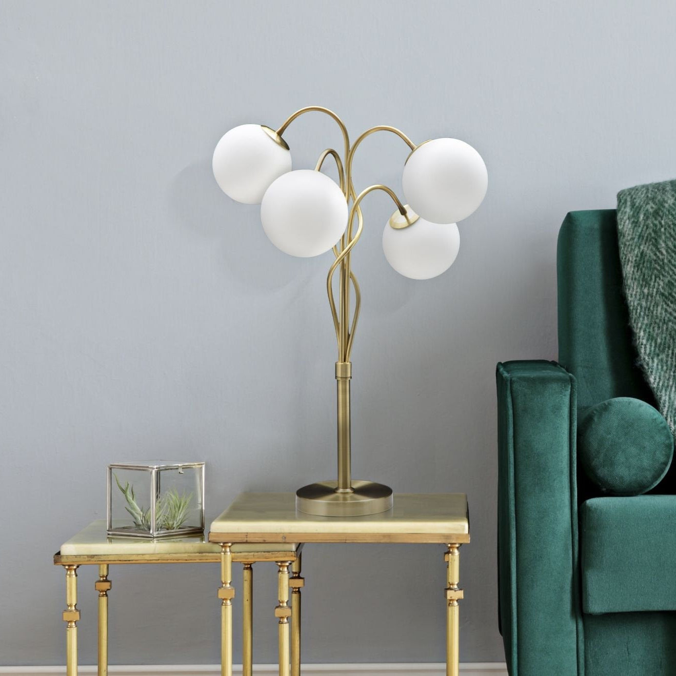 Lámpara de mesa dorada de 4 luces – Esferas de cristal opaco glamurosas