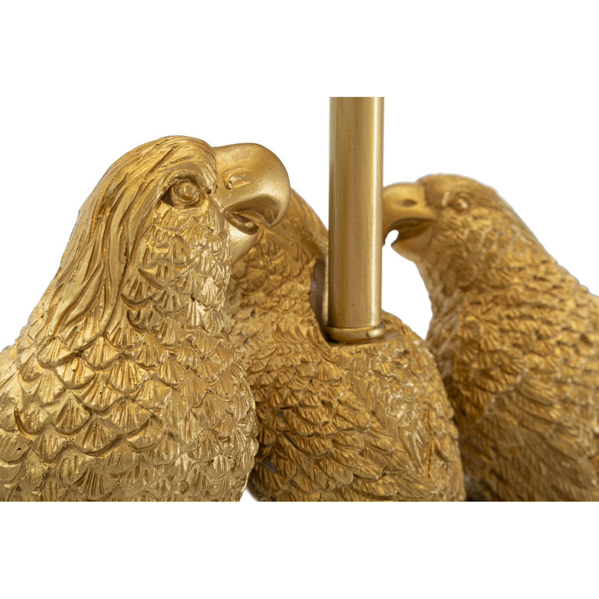 Lámpara de pie dorada con decoración de loro y pantalla negra