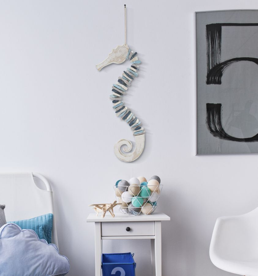 Escultura colgante de caballito de mar de madera con clavijas de colores