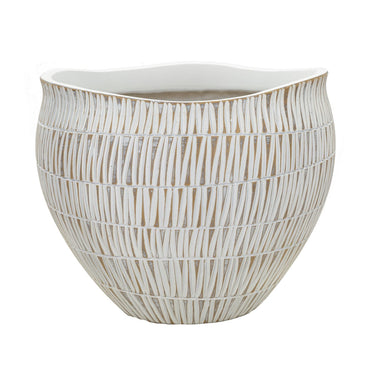 Maceta decorativa moderna de resina tallada con diseño geométrico lineal