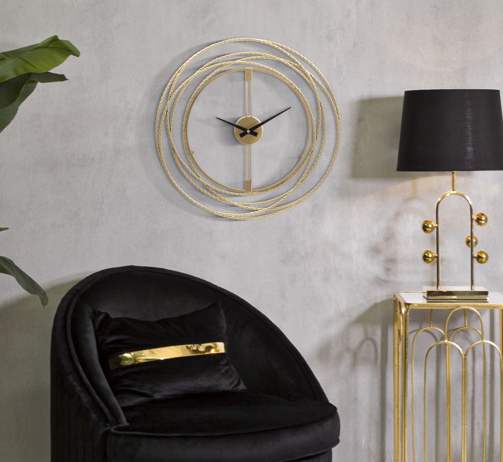 Reloj de pared con marco de círculo dorado – Diseño artístico moderno en metal