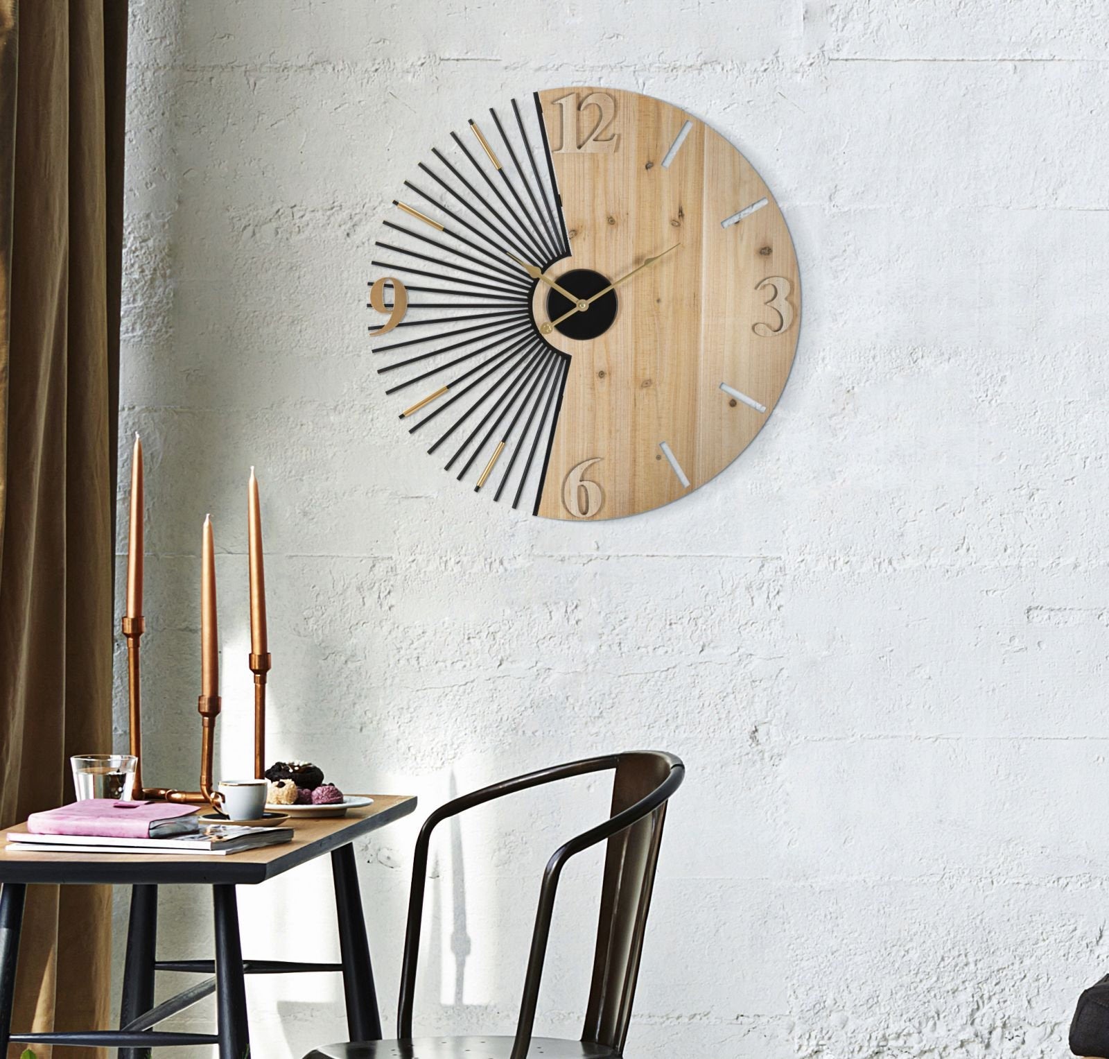 Reloj de pared de metal y madera inspirado en los rayos del sol – Diseño minimalista y natural
